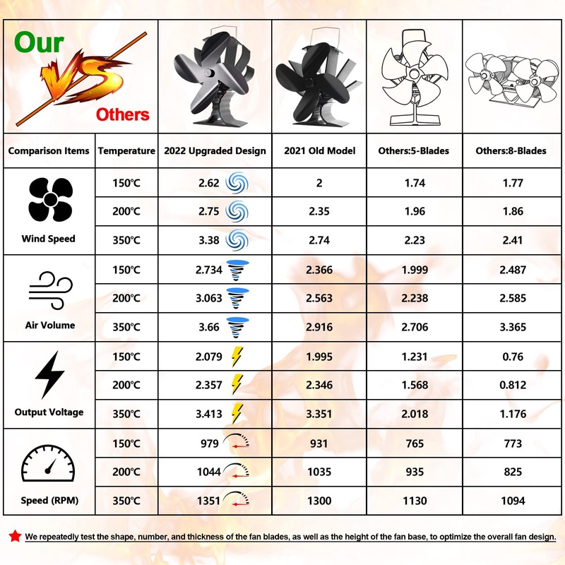 - Improve stove performance: This heat-powered 4-blade stove fan with wood burner increases the efficiency of your free-standing stove heater, stove or wood/wood burner by effectively distributing heat. Use the heat of your wood stove completely and distribute it to your room. And 38% of wood or fuel cost savings.