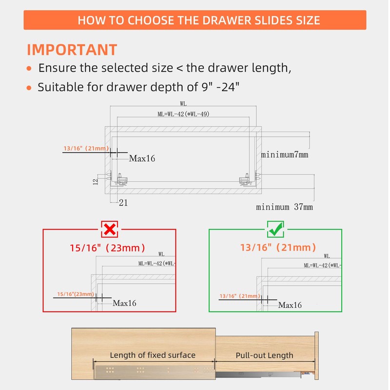 - - Ensure compatibility: Check the thickness of side panels and depth of drawers before purchase. Drawer side panel thickness should not exceed 16mm(5/8").