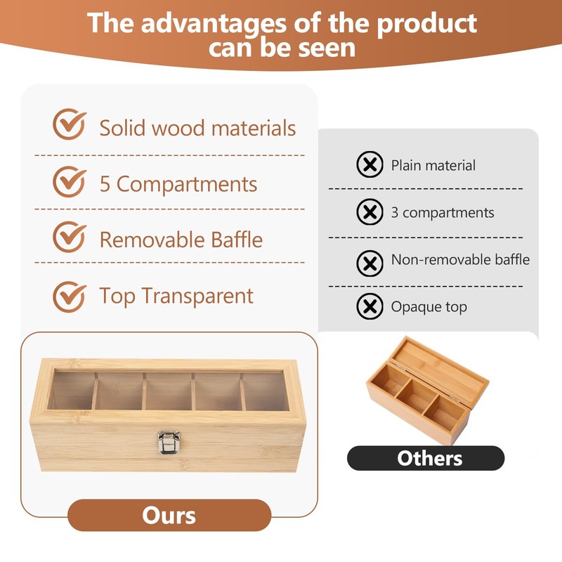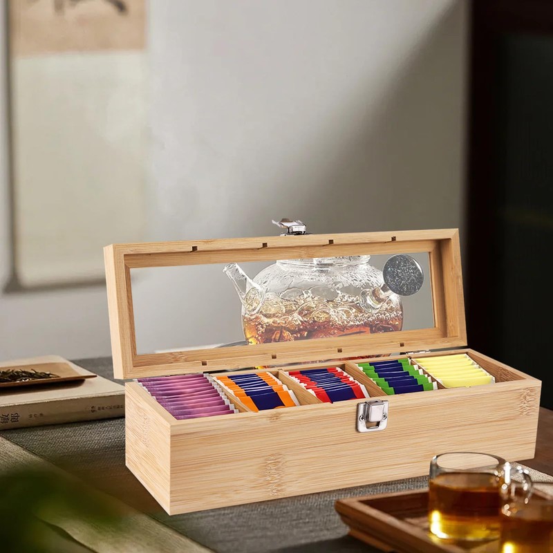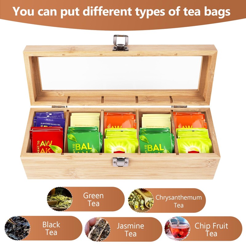 - Excellent material: tea box organiser is made of high-quality bamboo material, with smooth edges and no burrs on the surface, which will not hurt your hands. Strong load-bearing capacity, convenient daily cleaning and maintenance, long service life, durable and stable