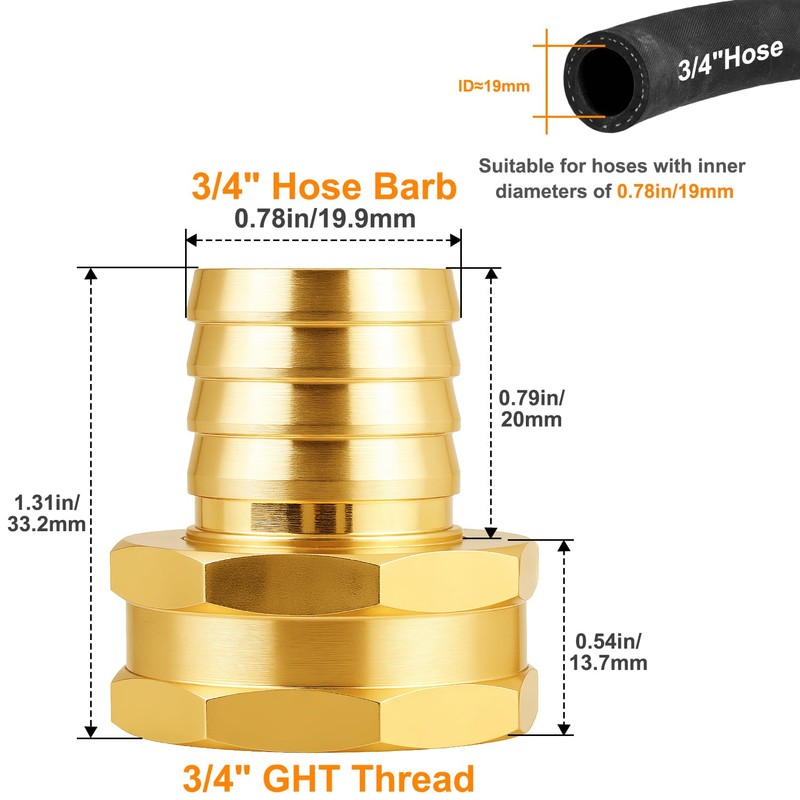 - Precise Fit: Equipped with a 3/4 - inch hose barb, it fits 3/4 - inch hoses. With a barb diameter of 0.78 inch (19.9mm) and a barb length of 0.79 inch (20mm), it enables a firm insertion. The GHT female thread is compatible with corresponding threaded- such as for Faucet/Bibb/Spigot | etc.