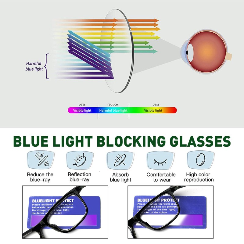 - Blue Light Blocking Lenses : Block harmful blue light and effectively reduce harmful blue light on mobile screens, electronic games,computers,televisions, and other devices. relieve problems such as eye fatigue,dryness,blurred vision, and migraines