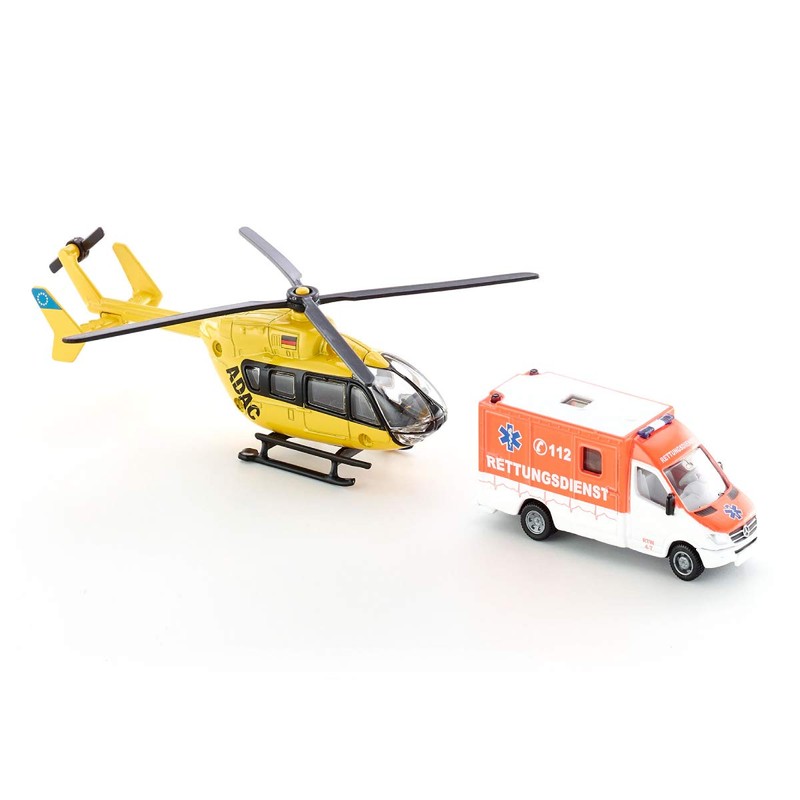 - Contents: 1x siku 1850 rescue vehicle set: 1 helicopter + 1 ambulance, Scale: 1:87, Material: Metal/Plastic, Dimensions: 15 x 7.5 x 6.1 cm, 0.109 kg, Multicolour, Series: SIKU Super