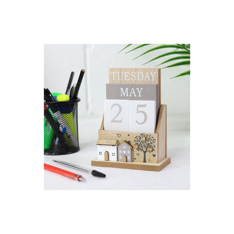 SiL Interiors Wooden Perpetual Calendar Desktop Eternal Calendar Blocks - Hou...