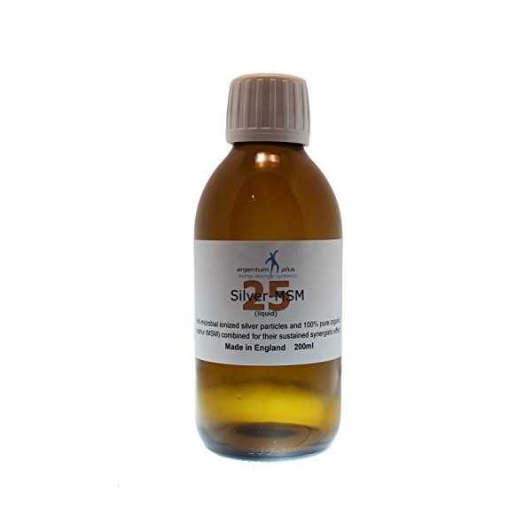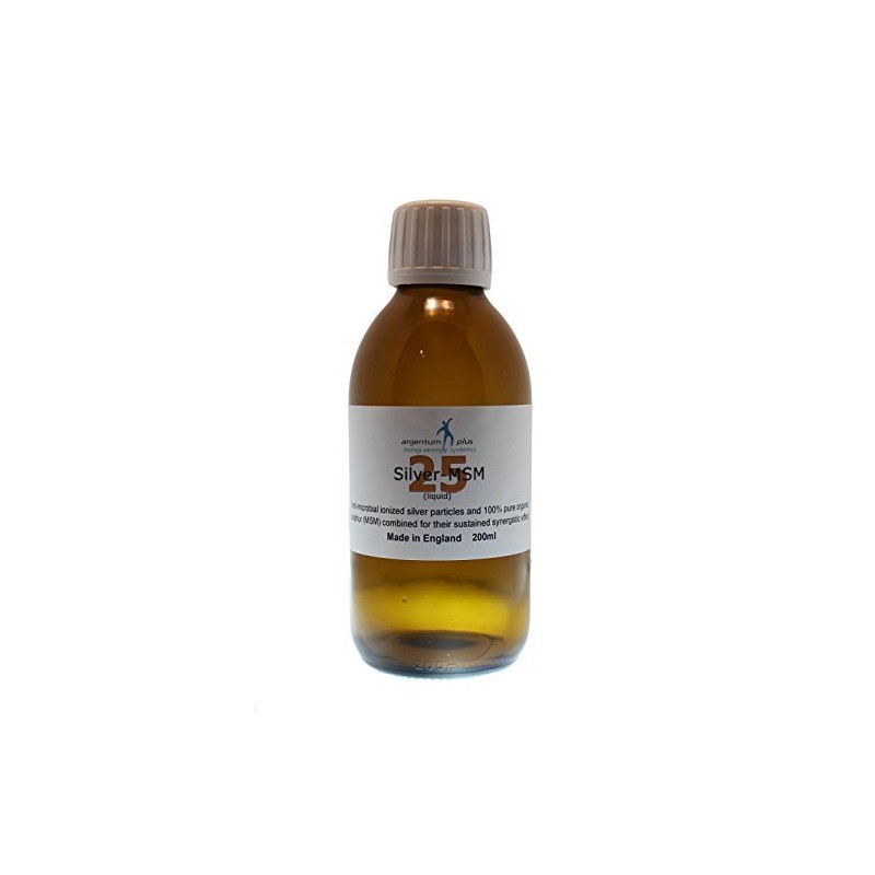 argentum plus Silver MSM 25 (liquid) contains silver and MSM (methyl sulfonyl methane), a biological form of sulphur. The combination of silver and MSM in a single compound increases the effect inherent in both substances individually many times. Silver content 100 mcg (micrograms) / 5 ml (millilitres). MSM - content 6000 mcg (micrograms) / 5 ml. The product comes with English stickers. We will send you a German translation separately.