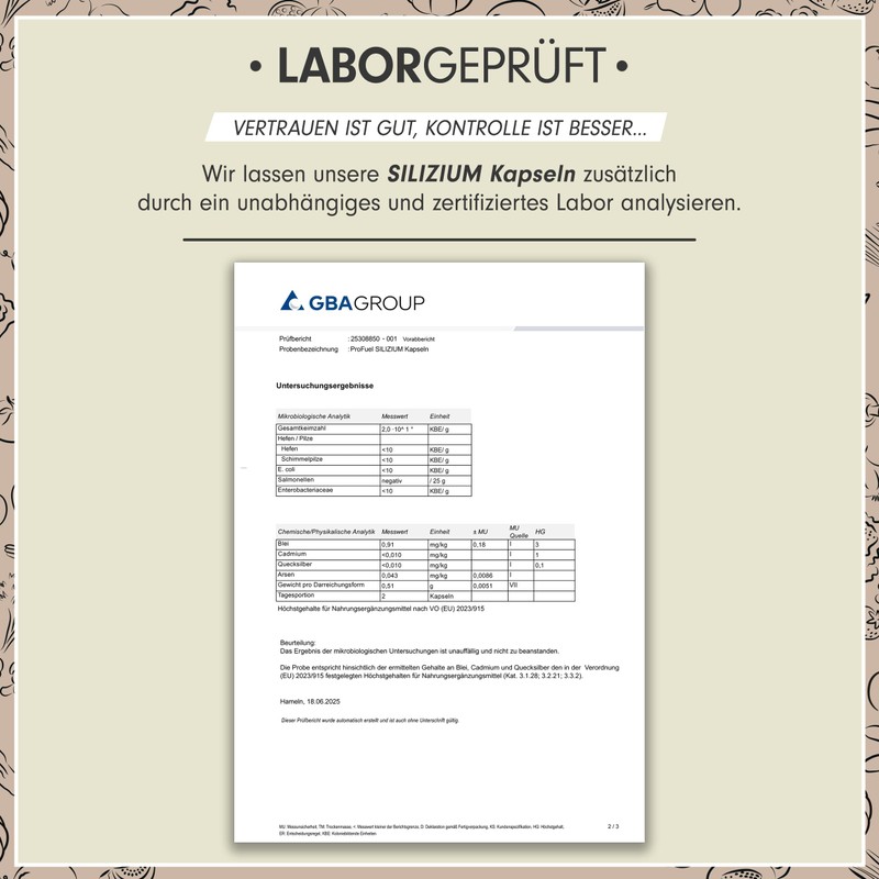The daily portion (2 capsules) contains a total of 714 mg silicon-rich bamboo shoot extract, which contains 536 mg of natural silica and thus provides the body with 250 mg of elemental silicon. The silicone capsules come in a large storage container with 240 capsules and are sufficient for 120 days or a full 4 months if taken daily.