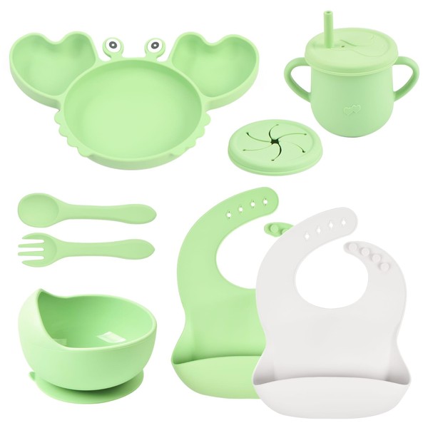 - Make feeding time more fun and easy for your baby with this beautiful 9-piece silicone utensil set, it includes 1 crab-shaped suction plate divided into 3 parts, 1 suction bowl, 2 bibs, 1 cup with straw, 1 snack lid, 1 fork and 1 spoon