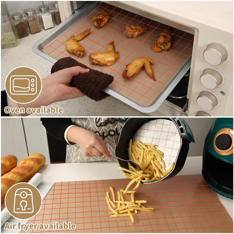 - 【Food Grade Silicone】 BPA free. The baking mat made from 100% premium quality food grade silicone material, it's non-stick and will not tarnish or discolor. It is durable and will serve you years for baking need. Oven & microwave safe from -104°F to 446°F (-40°C to +230°C), Dishwasher & Freezer Safe, They can be reused for many times.