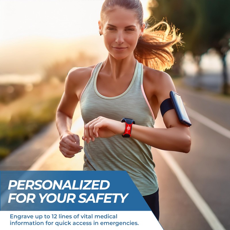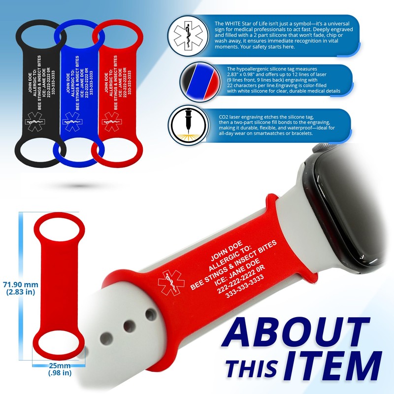- Custom-Fit Silicone Medical Alert ID Tag for Men & Women: This flexible medical ID tag slides securely over most smartwatch and sport watch bands—no need for a separate medical bracelet. Measuring 2.83" x 0.98", the wearable medical tag stretches to fit snugly and offers a comfortable, discreet way to carry your emergency medical information every day.