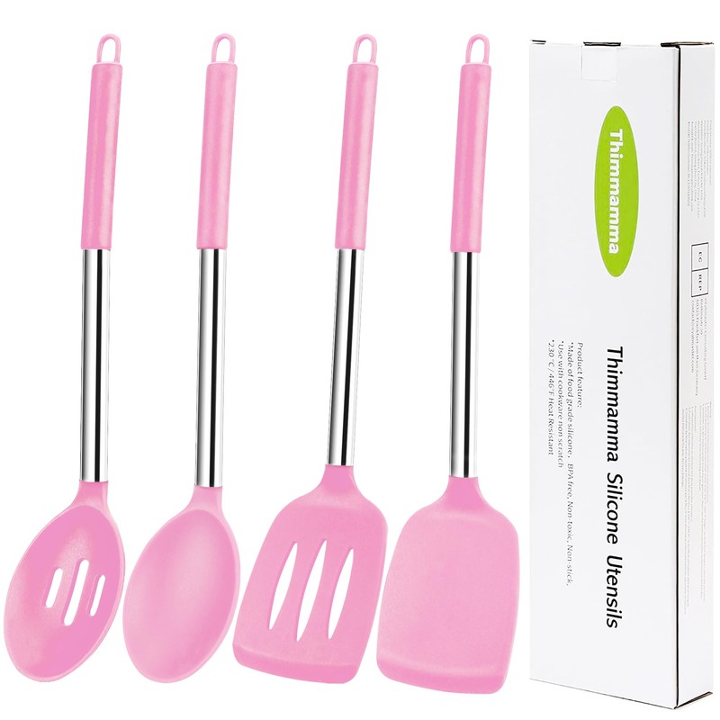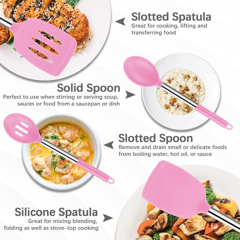 Silicone Spatula Spoon, Food Grade BPA Free Silicone Kitchen Spatulas Turner Spoons Set for Cooking, Heat Resistant Silicone Spatulas Mixing Stirring Spoons Utensils for Nonstick Cookware, Pink