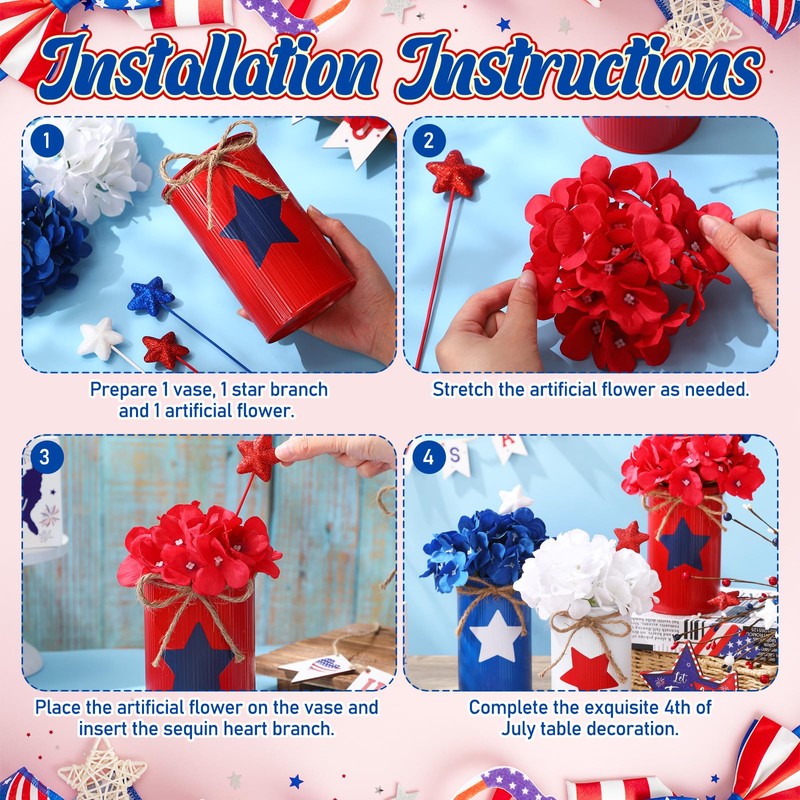 - Package Inclusion: each package of the 4th of July centerpiece includes 6 artificial flowers, 6 sequined star berry stems and 6 tin plated metal vases, these centerpieces work as standalone pieces or can be paired to create a lavish, Independence Day themed spread for any table