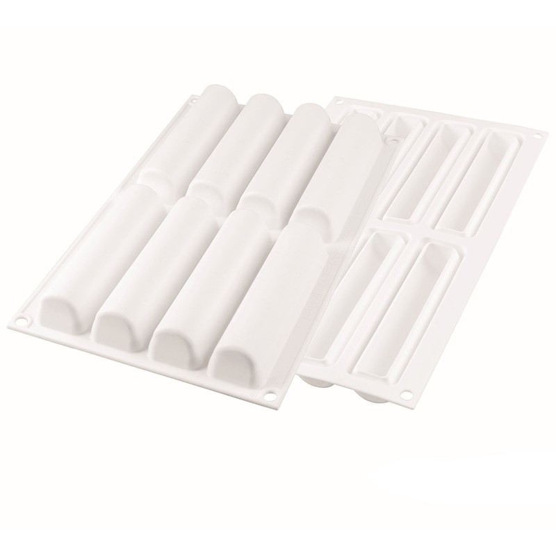 • Silicone mould (sold individually; both in the picture are intended for illustration purposes only to give a view from the top and bottom of the mould); The cylinder mould 75 allows the production of eight pieces of baked or frozen food in cylinder shape with a flat bottom but with a roundness shaped by the curved edge of each cavity. Volume of each cavity 2.544 ounces (7 ounces 5 millilitres); dimensions of each cavity 4.96 inches x 1.06 inches x 1.06 inches high.