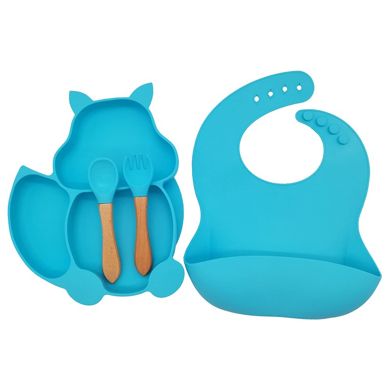 - This silicone baby feeding set including 1piece silicone baby plate +1piece wood and silicone spoon + 1piece wood and silicone fork + one piece silicone baby bib
