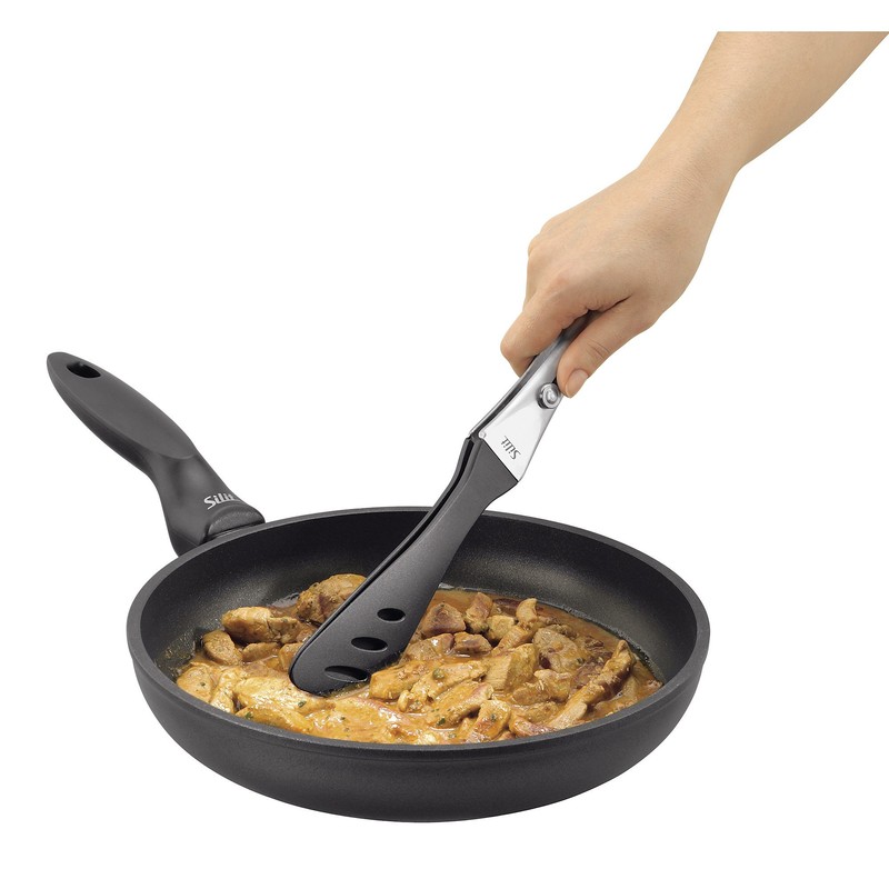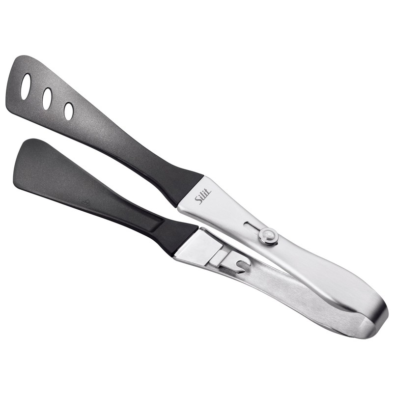 - A heat-resistant tongs for serving directly at the table, but also for electric barbecues and pans with non-stick coating. Excess grease drips off quickly and easily thanks to the cut-out