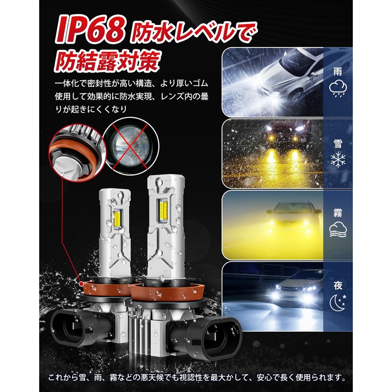 • IP68 Waterproof and Condensation Proof H11 LED Fog: The H11 LED Fog Lamp uses an effective waterproof material with IP68 level waterproof and has a high seal, and a thicker rubber exterior and a double waterproof ring on the back for effective waterproofing and preventing fogging inside the lens. You can use it for a long time with maximum visibility even in bad weather such as snow, rain, fog, etc. Use the latest H11 LED fog light for peace of mind even on rainy days