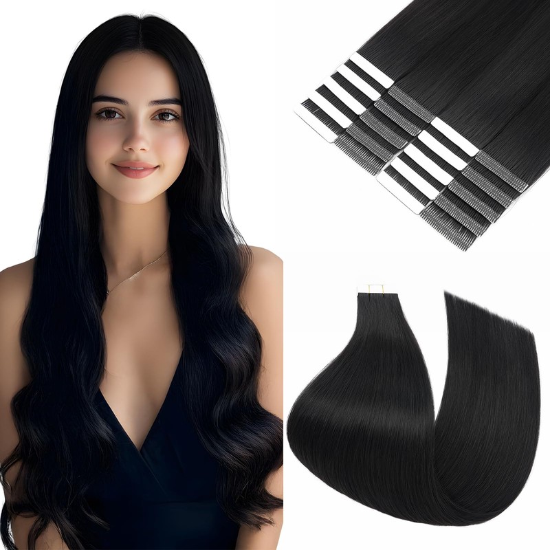 Silk-co Double Stitched Tape Extensions Real Hair Pack of 20, Tape-In Extensions Real Hair 50 g, Invisible Real Hair Extensions Tape, Hair Extensions Real Hair #01 Raven Black, 40 cm