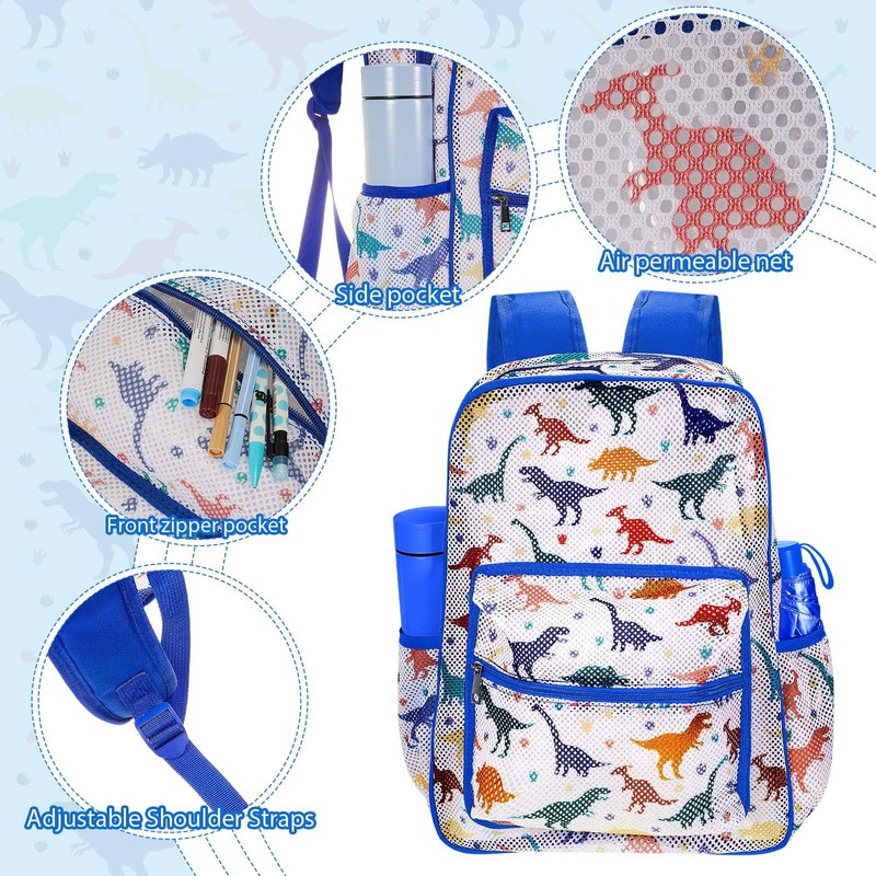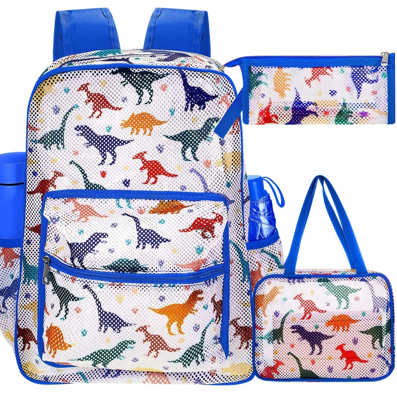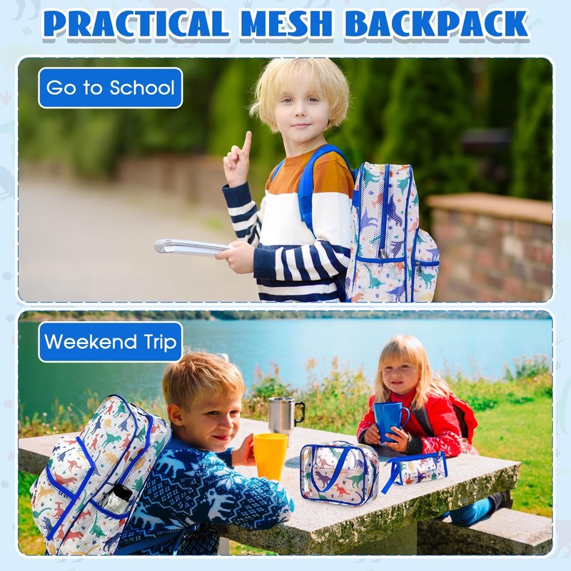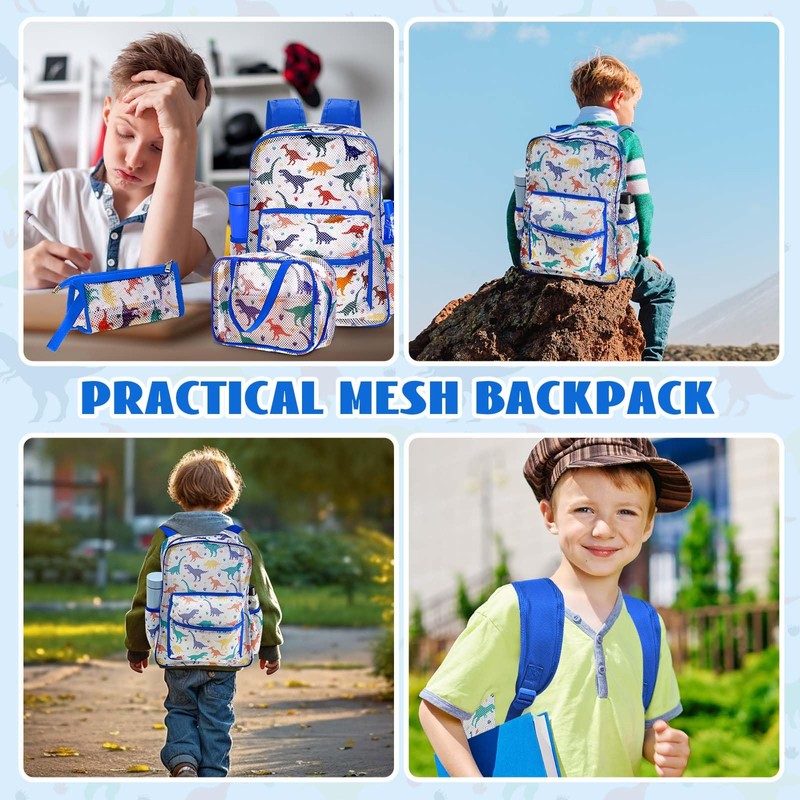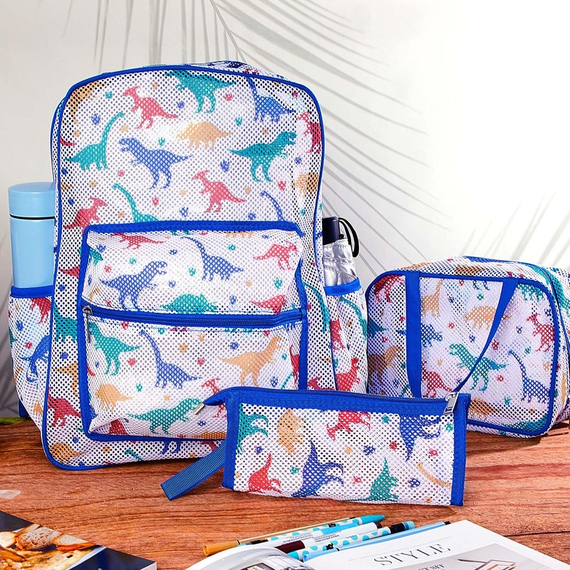 Silkfly 3 Mesh Backpack Set Semi-transparent bag for Women Heavy Duty bookbag with Pocket with Lunch Bag Pencil Case(Dinosaur)