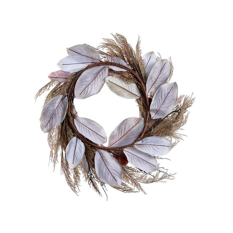 SilksAreForever 30" Artificial Pumpkin, Magnolia Leaf & Grass Hanging Wreath -Orange/Gray