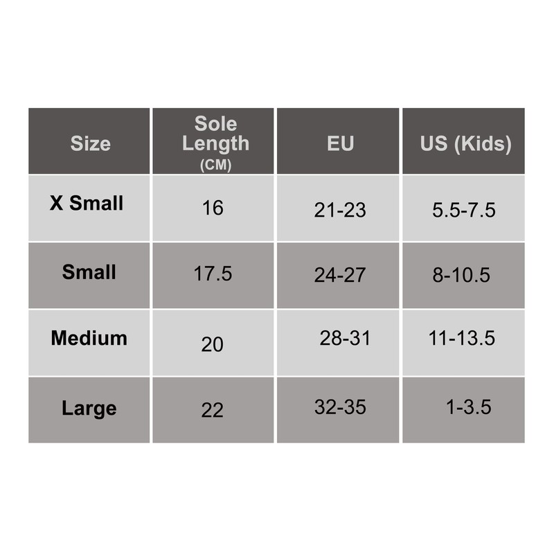 - Fits a toddler, little or big kid. SIZES: X-Small: 5.5-7.5 US Kids shoe size, Small: 8-10.5 US Kids Shoes Size, Medium: 11-13.5 US Kids Shoes Size, Large: 1-3.5 US Big kids Shoes Size