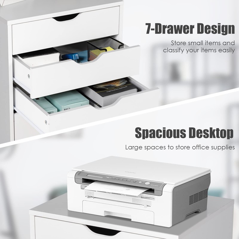 - [Maximize Storage Space]: Keep your home office, bedroom, and workspace well-organized with our 7 drawers filing cabinet! The office drawer unit is ideal for sorting desk supplies, makeup, beauty supplies, tools, crafts, and more. The flat top of the filing cabinet adds extra display and storage space for photo frames, potted plants, printers, staplers, and projectors.