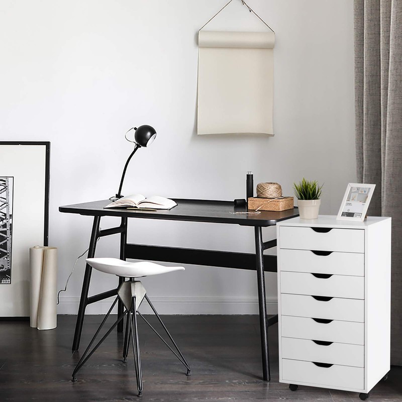 Equipped with four wheels, two of which are lockable, this storage unit can be securely positioned anywhere. Remove wheels for stationary placement. It has 7 drawers for desk items, makeup, crafts, and tools. Built with premium materials, the file cabinet is durable and built to last. The small filing cabinet does not take up too much space and can be matched with most computer desks. Ideal for bedroom, living room, study, office, etc. Anti-tilt design adds stability to drawer storage. Clear instructions make installation hassle-free. A smooth surface is easy to clean and maintain.