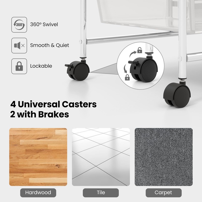 - Smooth Mobility with 4 Universal Casters: Equipped with 4 durable 360° swivel wheels, this utility cart with drawers glides effortlessly across floors. Two lockable casters provide added stability, ensuring the craft storage cart stays securely in place when needed. The side handles make it easy to maneuver, whether in your home, office, or studio.