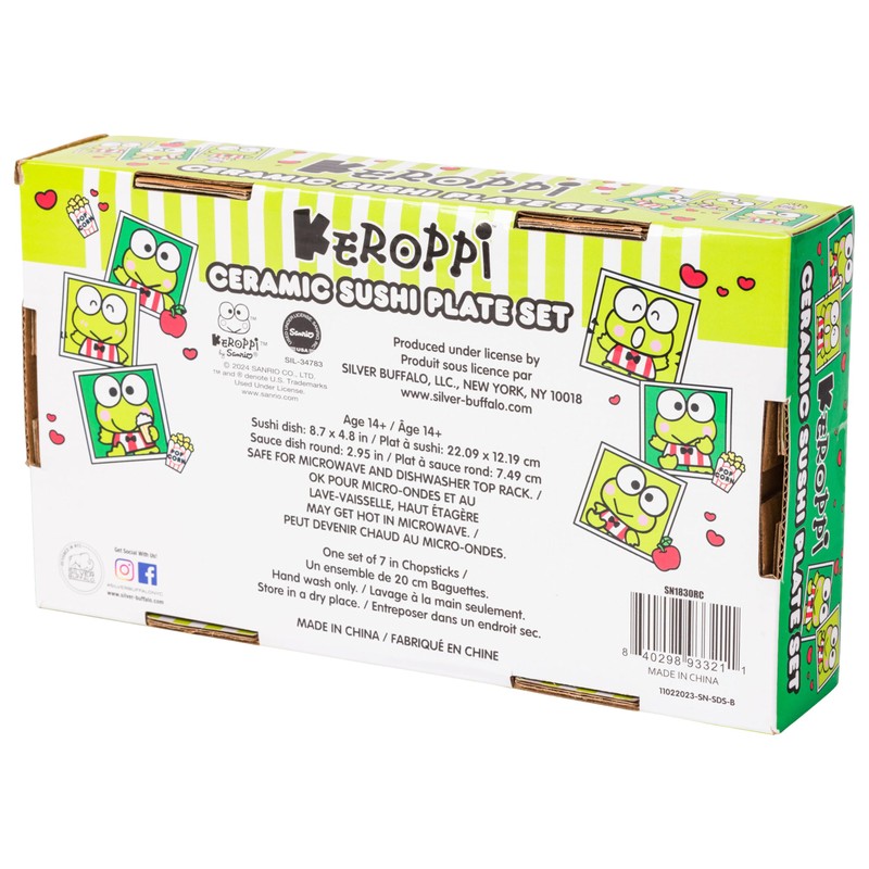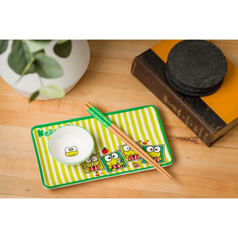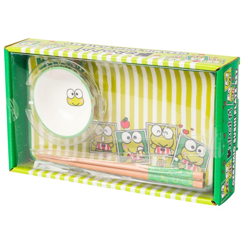 - KEROPPI SUSHI SET: Dive into the world of Sanrio with this Keroppi Green Stripe 3 Piece Ceramic Sushi Set, featuring everyone's favorite frog character