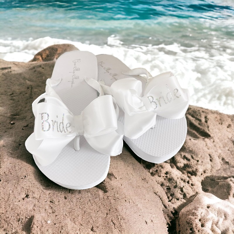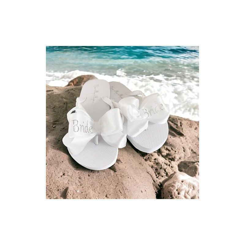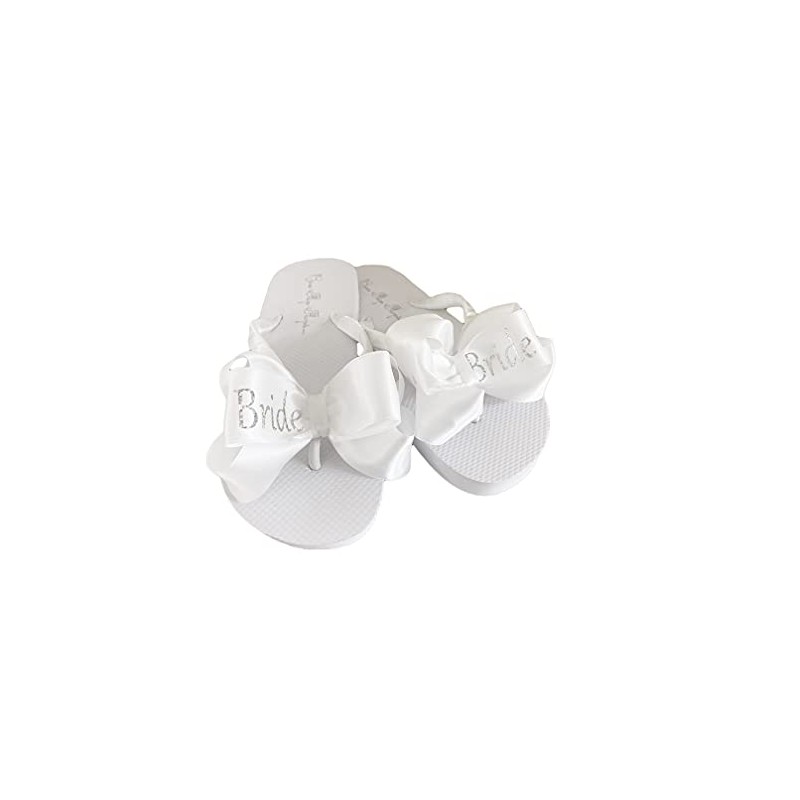Silver Glitter Bride Bows on White Flat Wedding Flip Flops (White Bows/Silver Bride, 11)