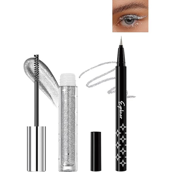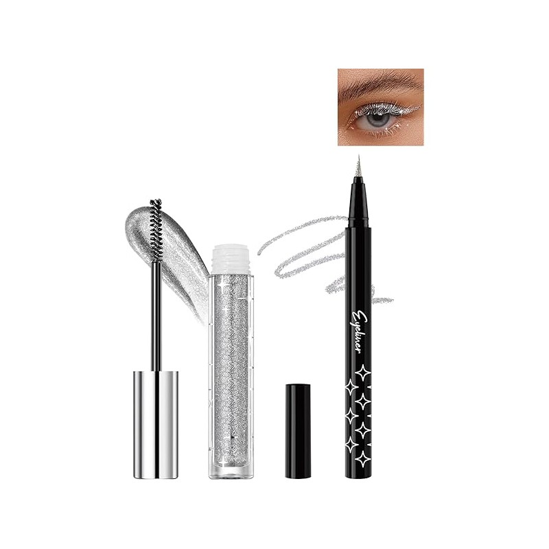 Silver Glitter Mascara + Eyeliner Pen Set, Shimmer Volume Colorful Mascara, Sparkling Liquid Eyeliner, Waterproof, High-Pigmented, All-Day Wear Shine Eye Makeup for Dazzling Looks
