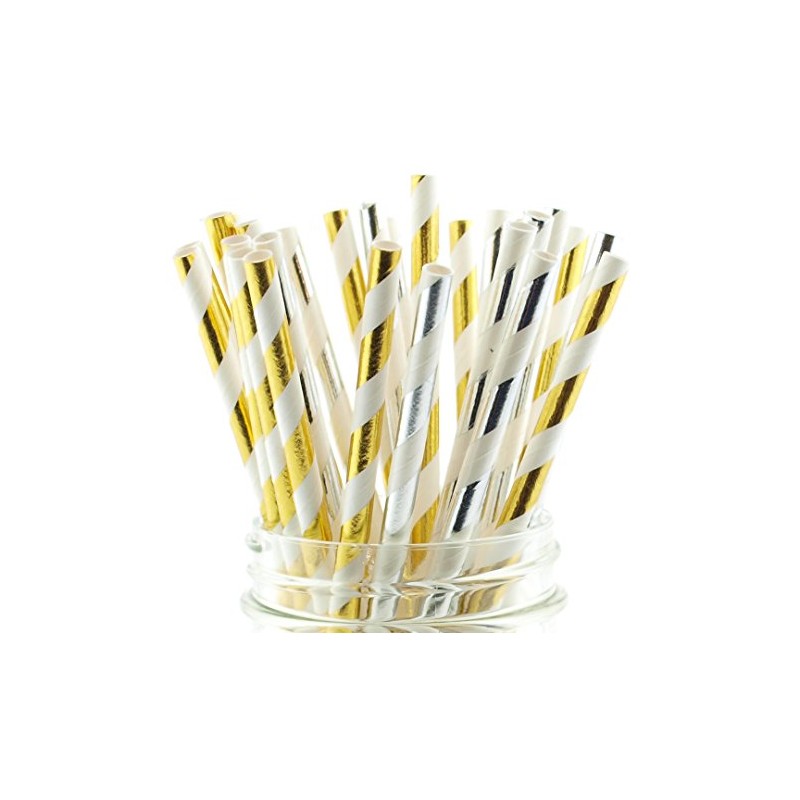 Silver & Gold Shiny Tinsel Holiday Straws (50 Pack) - Formal Christmas Party Supplies, Black Tie Event Paper Foil Straws, Gold & Silver Hollywood Parties