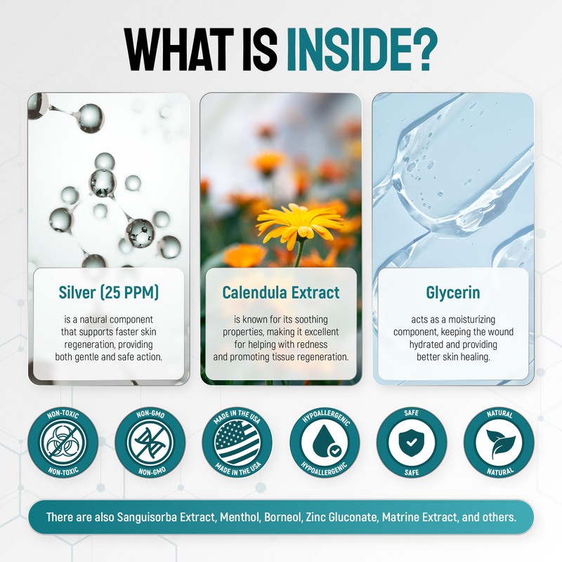 - 🔷 SILVER FORMULA – Silver (25 PPM), Sanguisorba Extract, Calendula Extract, Menthol, Borneol, Allantoin, and other natural components that work in a complex to provide the best action for pet’s skin.