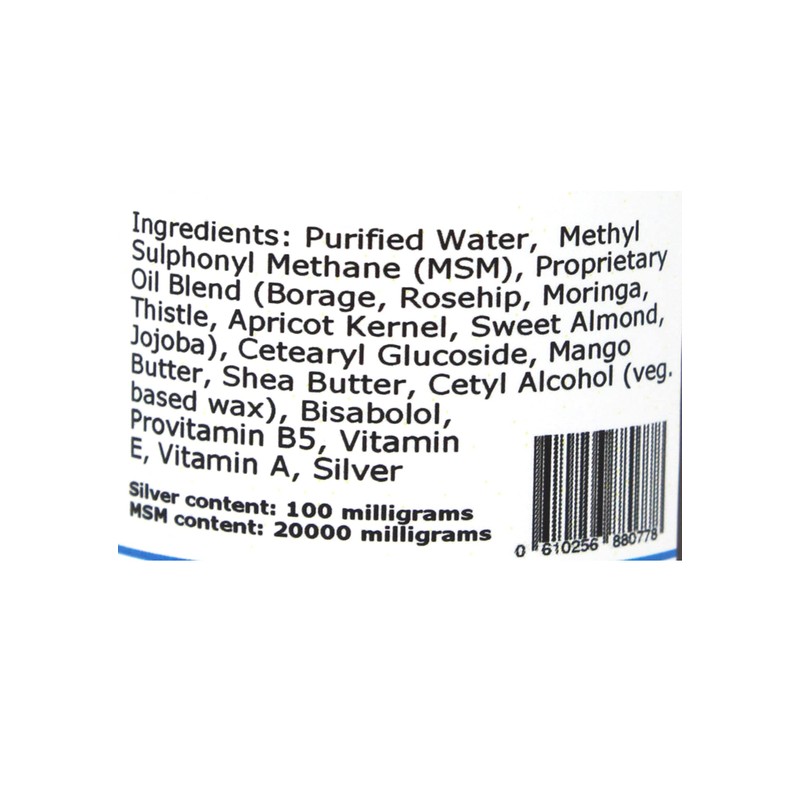 Silver MSM Dry Eczema Lotion has been developed as a non-steroidal, natural product for the care of skin prone to eczema and dermatitis. It is deeply nourishing and at the same time moisturising and skin-soothing. Effective care of skin prone to eczema requires the maintenance of a sufficient moisture level in the skin. To achieve this, the skin cells need essential fatty acids and vitamins in their membranes. The application of silver MSM lotion for dry eczema delivers it directly and in abundance: the proprietary oil blend contains large amounts of omega 3 & 6 & 9, GLA (gamma linolenic acid) with natural vitamin A (retinol) and vitamin E (tocopherol). Elementary silver and MSM form the basis of all our skincare products: silver has an anti-microbial and protective effect. Our lotion contains MicroSilver TM, a superior anti-microbial active ingredient that creates a very strong silver effect. Very effective and safe in long-term use, the MicroSilver TM particles are clinically detectable able to release active silver ions to the skin for 12 hours. MSM is the often overlooked nutrient used by skin cells for healthy renewal to form flexible, fully functional cell membranes. The use of cold-pressed oils of the highest quality further enhances the nourishing effect of this lotion. Silver MSM Dry Eczema Lotion is fragrance free. All ingredients are based on plant and mineral substances. Not tested on animals. No Petro Chemicals - No Parabens - No Phthalates. The product comes with stickers in English. Ingredients: purified water, methylsulfonylmethane (MSM), own oil blend (borretch, rose hip, moringa, thistle, apricot kernel, sweet almond, jojoba), cetearyl glucoside, mango butter, shea butter, cetyl alcohol (vegetable wax), bisabolol, provitamin B5, vitamin E, vitamin A, silver
