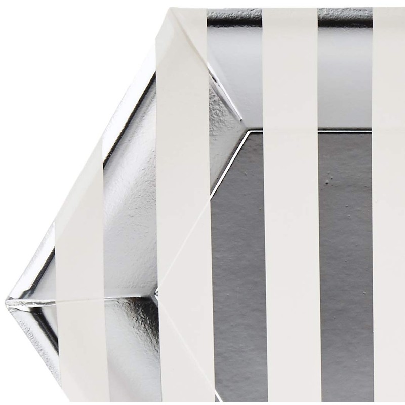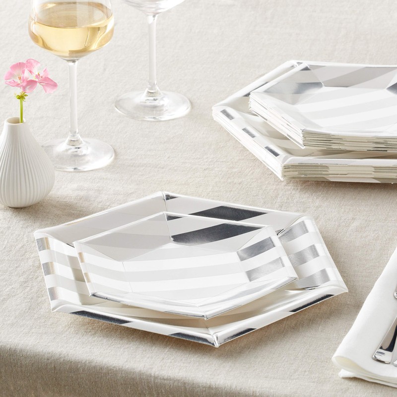 * Made from the finest paper on the market. All our products undergo strict quality control to meet the high standards of our customers. * Our eco-friendly non-toxic disposable paper plates are safe to use anytime and anywhere. * Classy & elegant, yet affordable. * These plates will enhance the appearance of your food displays and will create the perfect setting for your event. * This is a hassle-free alternative to using real China dishes and worrying about rental fees or broken pieces. * Our disposable tableware collection will enhance your party and turn it into a magnificent and memorable experience. **Set your table to perfection with this Stripe Collection White Silver Stripe Dinner and Side Plates.** With its fine look and elegant contrasting design these plates are sure to bring your event to the next level.