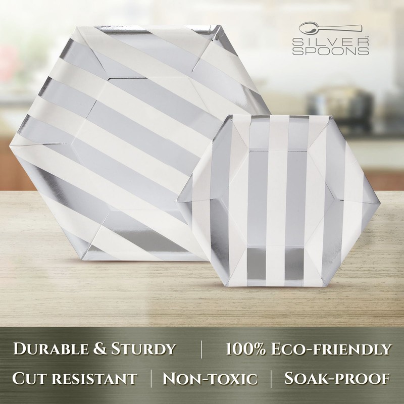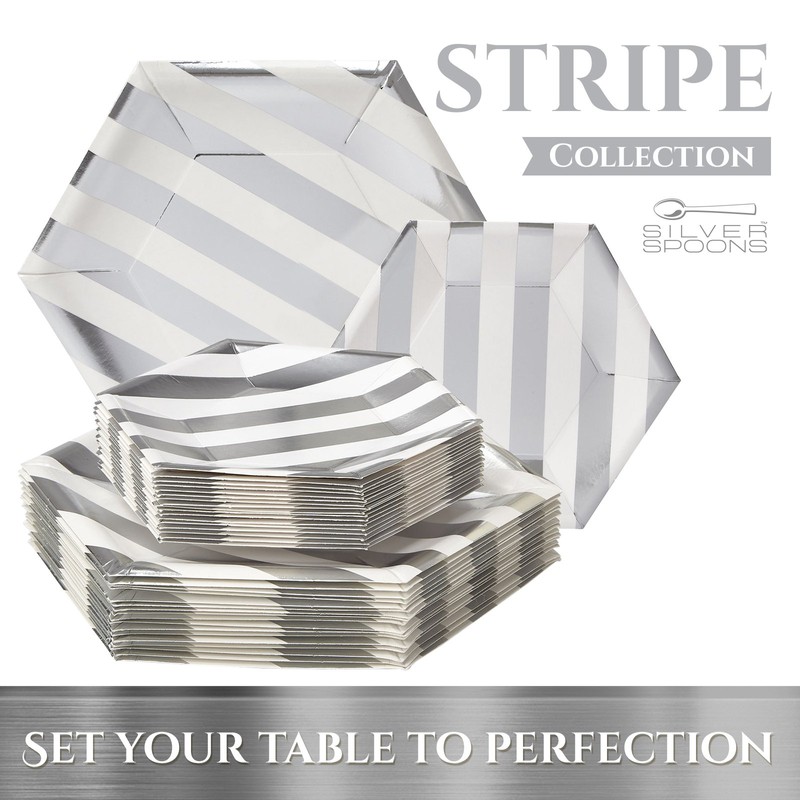 Silver Spoons Disposable Dinnerware Set Stripe Collection, 18 Servings, White/Silver