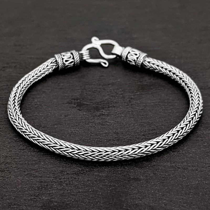 - FINE JEWELLERY TO CHERISH - 925 sterling silver chain bracelet with a Bali style heavy snake chain band and an S hook clasp. Length 19 cm. Width 4 mm. Fits a wrist size of up to 17 cm. Weight 17.29 grams. These solid 925 silver bracelets for men and women make stunning luxury friendship bracelets.