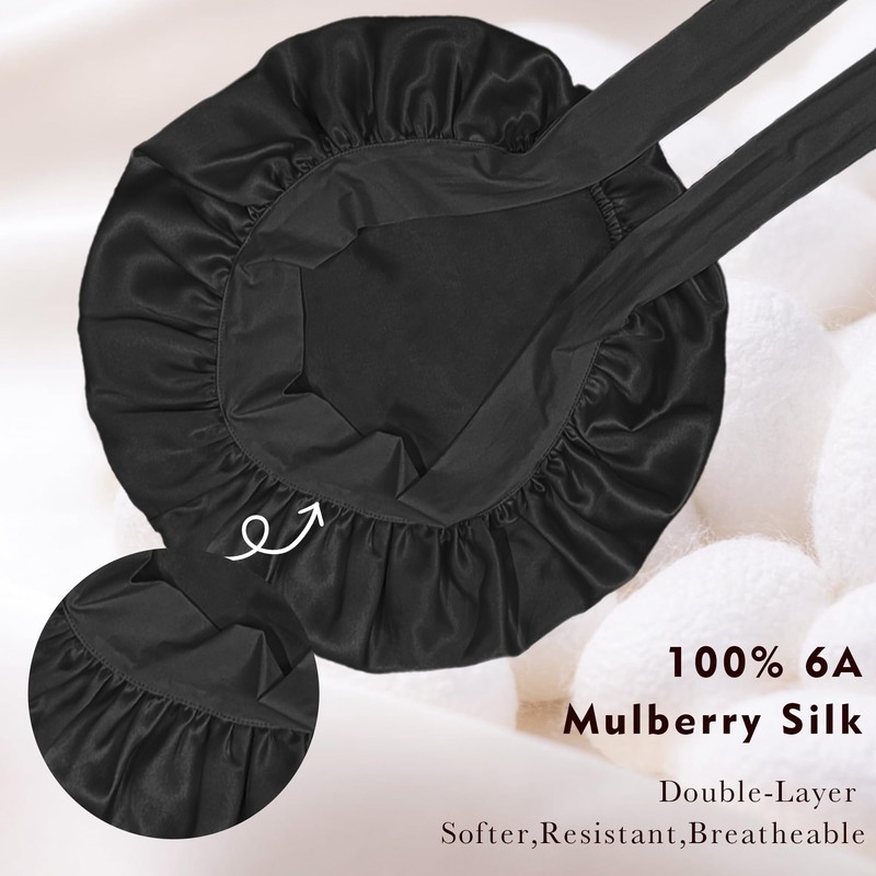 Simnice Premium Mulberry Silk Bonnet for Sleeping Women Girls, Large Double-Layer Silk Bonnet with Soft Elastic Band, Non-Slip Turban Adjustable Night Hair Cover for Sleeping, Black
