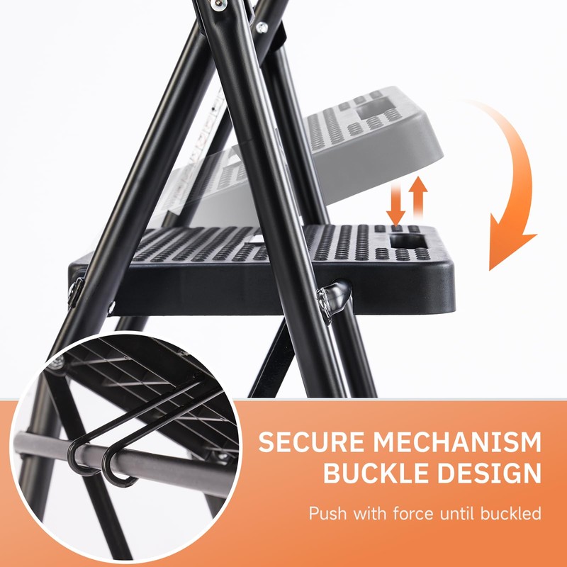 - Safety and Stability:This step stool is designed with support rods and crossbars to effectively distribute weight, supporting up to 800 lbs. It is also equipped with an automatically locking metal safety buckle, ensuring safety and stability during use.