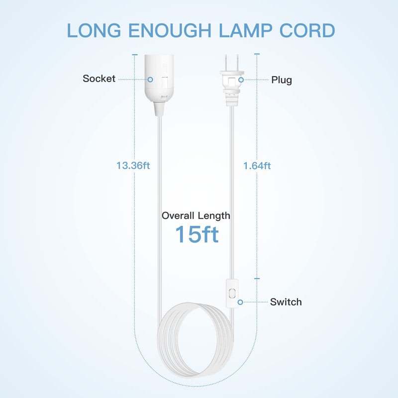 - Extension cable: 15 feet long satisfies for most hanging light applications; Fits standard E26/E27 Socket and On/Off toggle switch; Max Wattage: 360W, 120V-250V