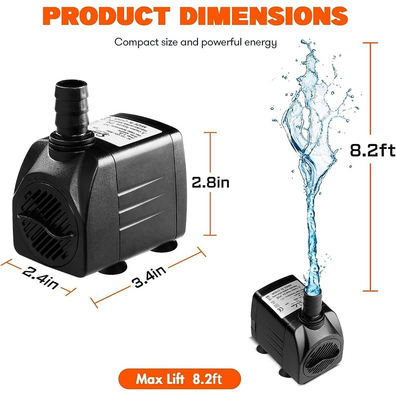 - Specifications: Dimensions: 3.4*2.4*2.8inch; The 6ft long power cord offers convenient installation; An Adjustable Knob to control the water flow rate; Max Flow Rate: 400 GPH (1514L/H), Max Lift height: up to 8.2 Feet, Watt: 30W; Voltage:110-120V