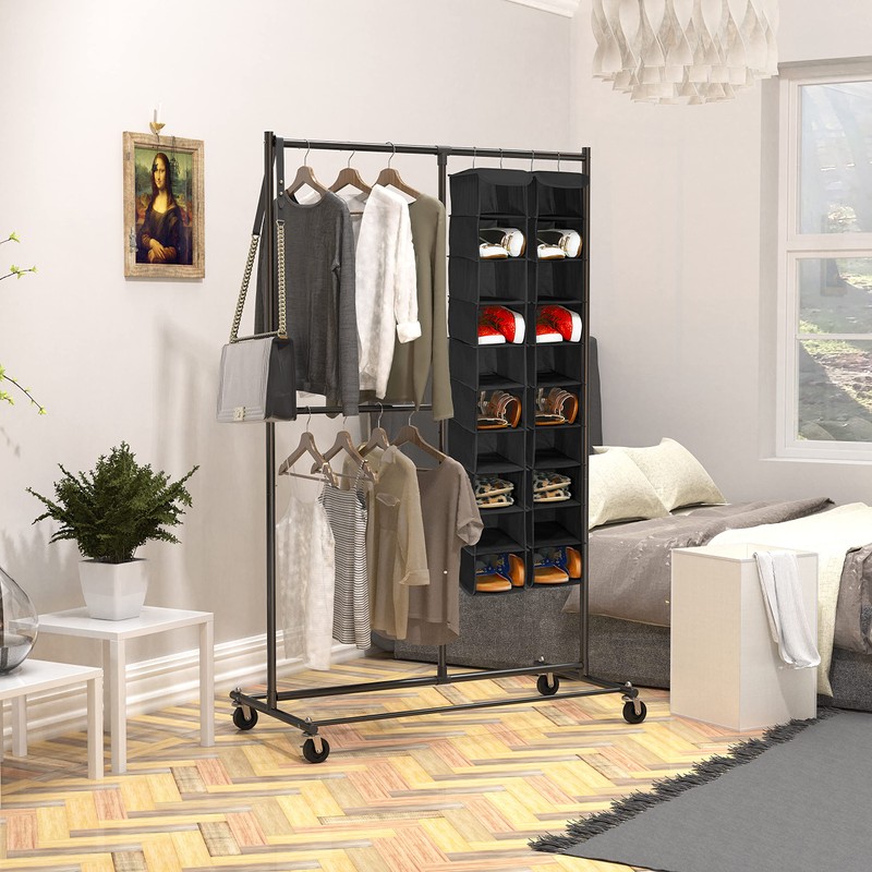 - Hangs on standard closet rod, wired closet rack