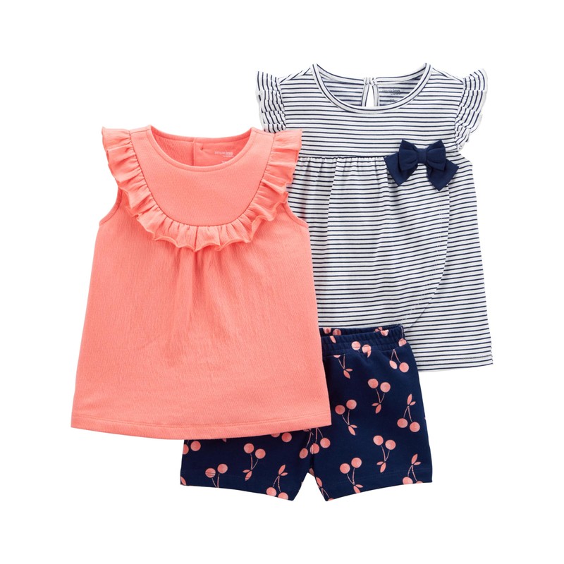 Outfit your stylish little girl with the perfect mix of comfort and style in this versatile 3-piece playwear set for baby girls from Simple Joys by Carters. This set includes two coordinated tops and a comfy pair of pants (or shorts), allowing for endless outfit combinations. Whether its a long-sleeve top with pants for cooler days or a short-sleeve top with shorts for warm playdates, these sets adapt effortlessly to any season. With playful prints and eye-catching patterns, each piece is designed to mix, match, and stand out. Ideal for active girls these outfits are crafted for both durability and fun, making this set a must-have for any little adventurers wardrobe.