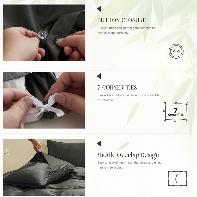 - [Thoughtful Details]: Perfectly blend functionality, elegance, and convenience. Our middle overlapping closure design offers a clean, polished appearance while securely holding your pillow in place all night, preventing slipping and awkward adjustments. The duvet cover features a discreet hidden button closure with a protective fold to keep buttons secure. Inside, 7 corner ties prevent the comforter from shifting, ensuring even fill distribution and a peaceful night's sleep