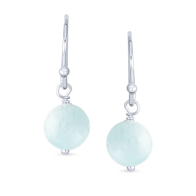 Simple Plain Blue Aquamarine Gemstone Round Dangle French Fish Hook Wire Ball Drop Earrings For Women .925 Sterling Silver