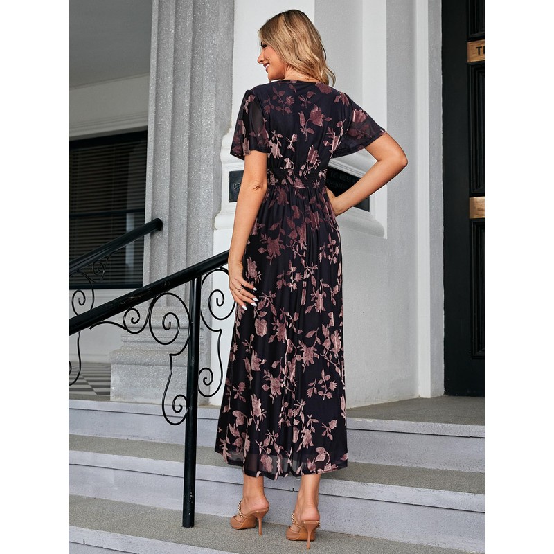 - 💝SHORT SLEEVE VELVET DRESS: This fashion velvet floral maxi dress use 100% polyester material and it’s make the dress durable, daily, soft and comfy. The Velvet dress uses new technology to create a floral pattern, comfy material with unique design makes it more elegant. The V neck velvet maxi dress has no zipper on the back, but has elastic at the waist for easy wearing. The A-line smocked high empire elastic waist design hides the small belly.