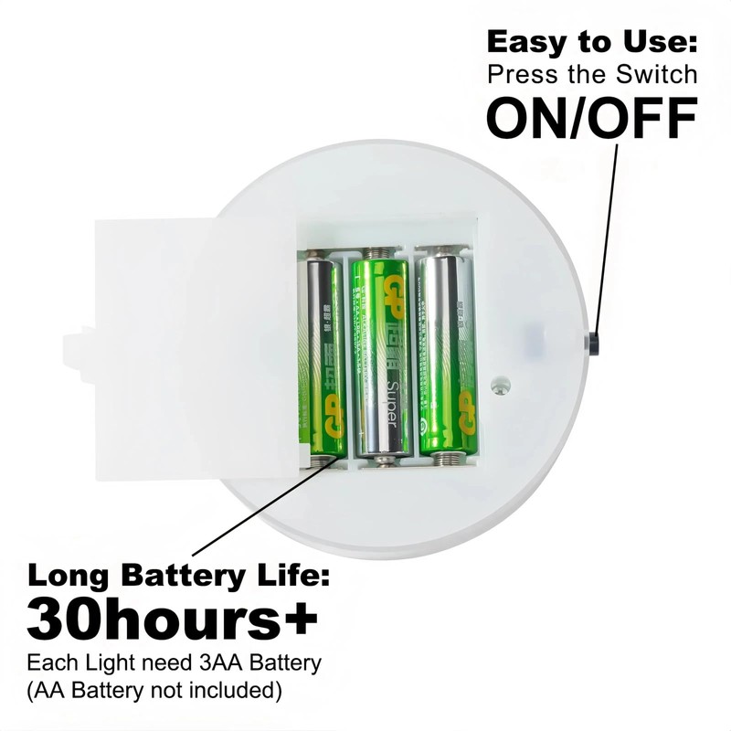 - Easy to Use:Simply Press the Switch ON/OFF.Each light require 3AA Battery(AA Battery not including)