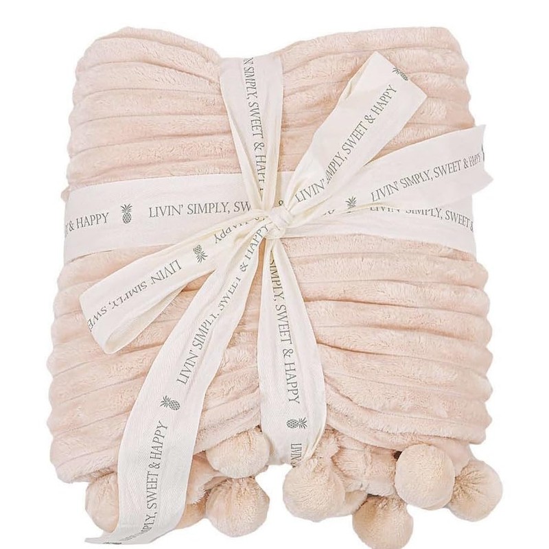 - Snow Luxe Blanket By Simply Southern features a beige cream stripe textured ultrasoft fleece blanket with pom pom detail on each end, a Simply Southern PU Leather patch, and tied with a pineapple logo ribbon. 100% Polyester. Measures 50" x 60". Machine wash cold. Tumble dry low. Warm iron if needed.