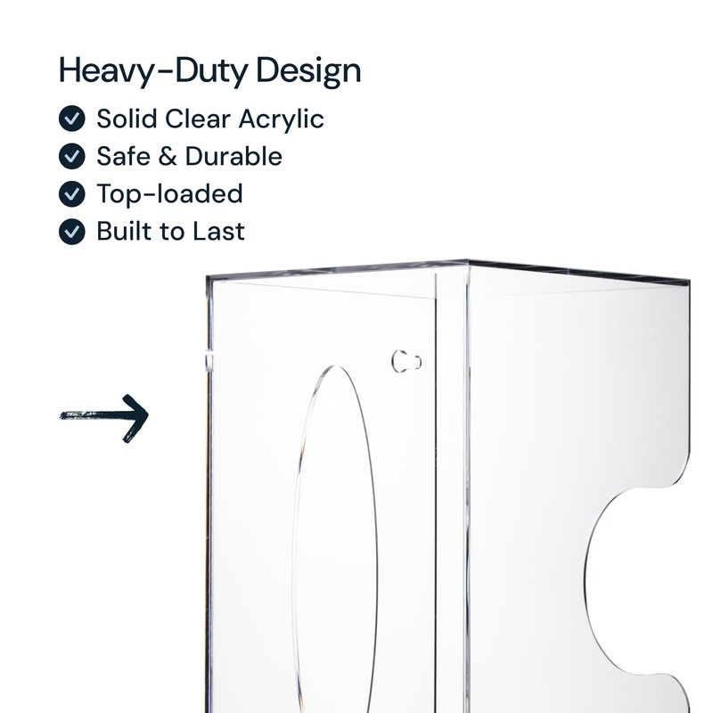 - Ultimate Organizer: With our Glove Box Holder Wall Mount and Acrylic Tissue Dispenser, you get two functional pieces in one. Easily store and access your tissue box and wipes and gloves neatly organized. Perfect for any setting, from hospitals to homes! You can fit large size gloves box! - TISSUE/GLOVES NOT INCLUDED!