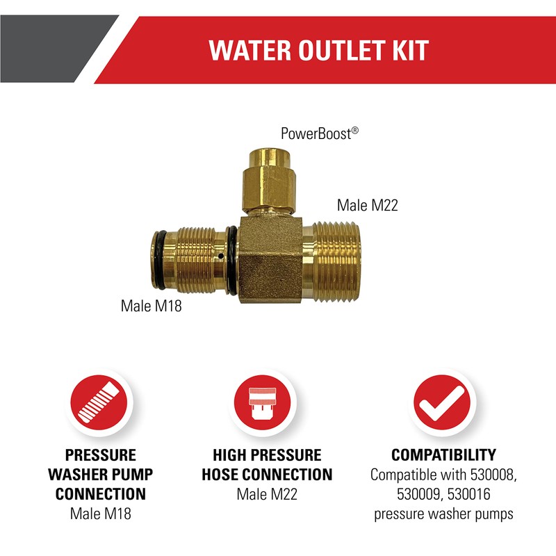 - COMPATIBILITY: Check the pump model number before ordering to make sure you get the right part; This water outlet replacement fitting is compatible with these models of AAA brand pressure washer pumps: 530008, 530009, 530016