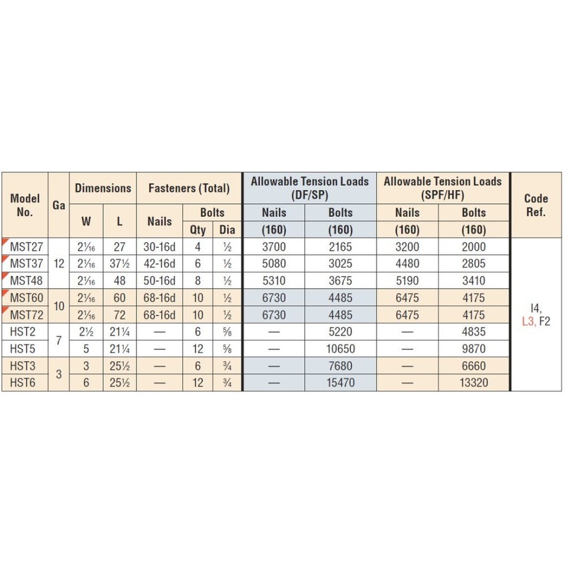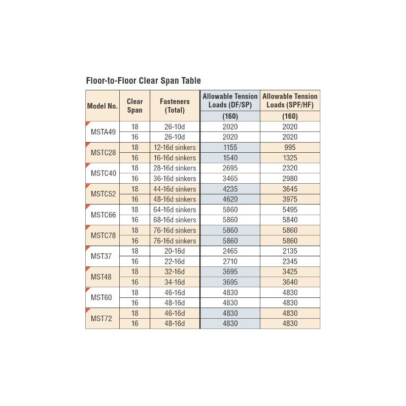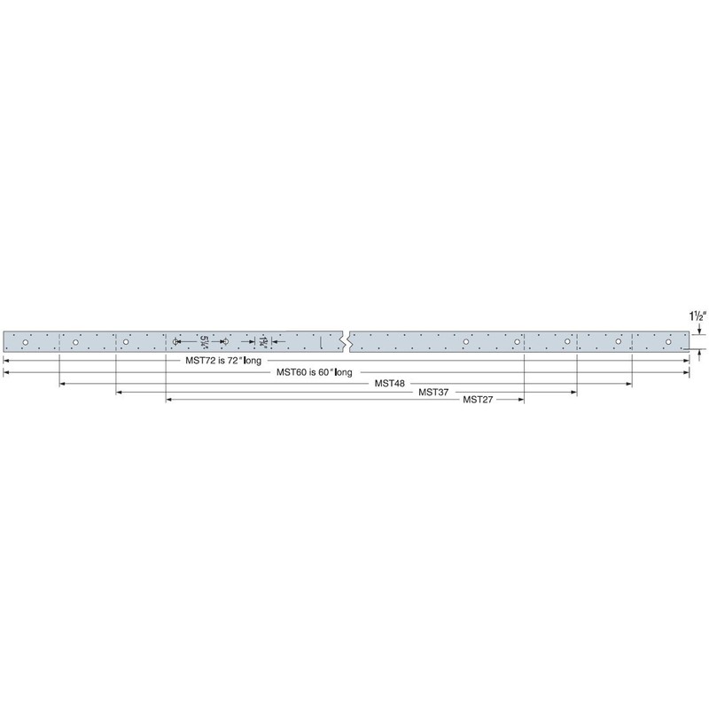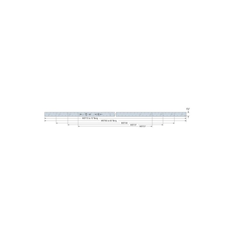 Simpson Strong-Tie MST48 Strap Tie is to be used with 16d Fasteners and 1/2-inch bolts. 10 Gauge, 2-1/16-inch by 48-inch strap tie. Zinc galvanized finish containing 0.90oz of zinc per square foot of surface area (total both sides)