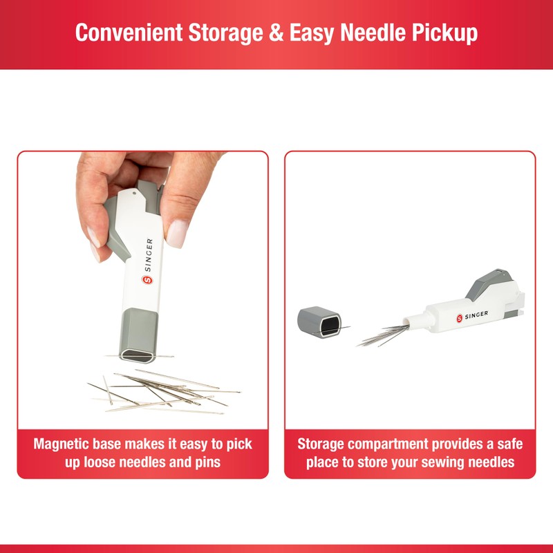- Storage compartment and magnetic base helps keep hand sewing needles organized