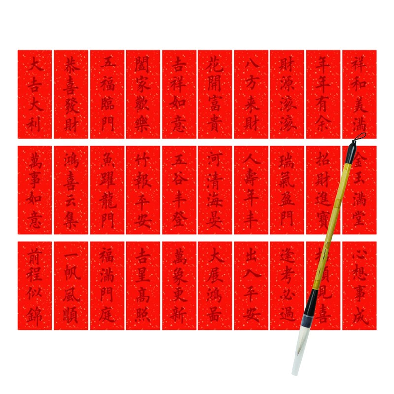 - [Chinese Couplet Set]: You will receive 60 pieces of small Chinese couplets in red, including 30 different Chinese blessings, 2 pieces of each blessing, and a Chinese brush. These Chinese Spring Festival couplets are good for decorating your house. The red Chinese New Year door banner is an ideal choice for Chinese New Year decoration in 2023. It is suitable for Chinese New Year party welcome sign props and Chinese New Year door wall decoration.